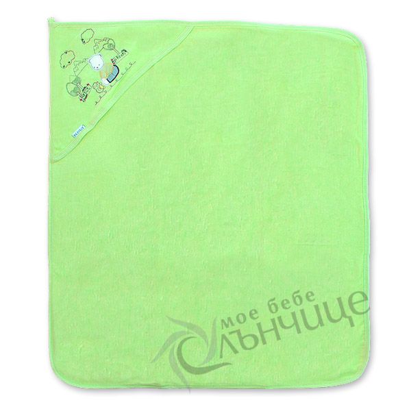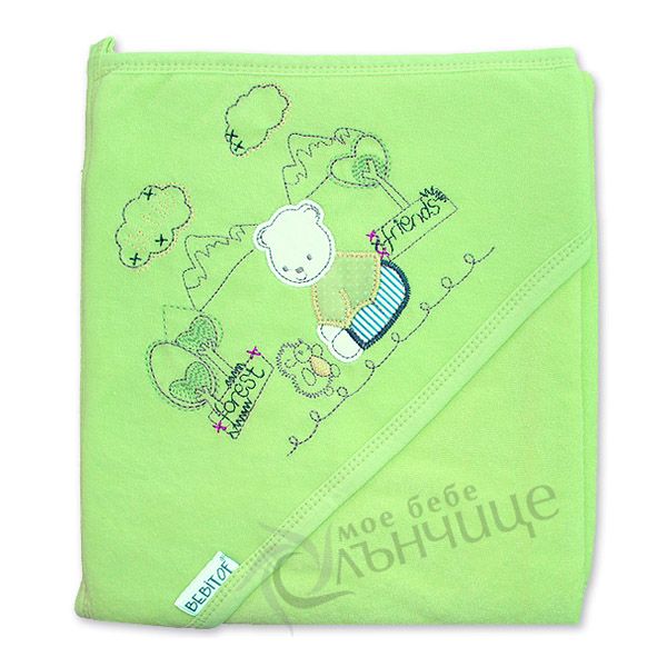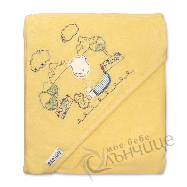 - Бебешката хавлия се предлага в цветове жълто и зелено с щампа на щастливо мече заобиколено от ведра зеленина.