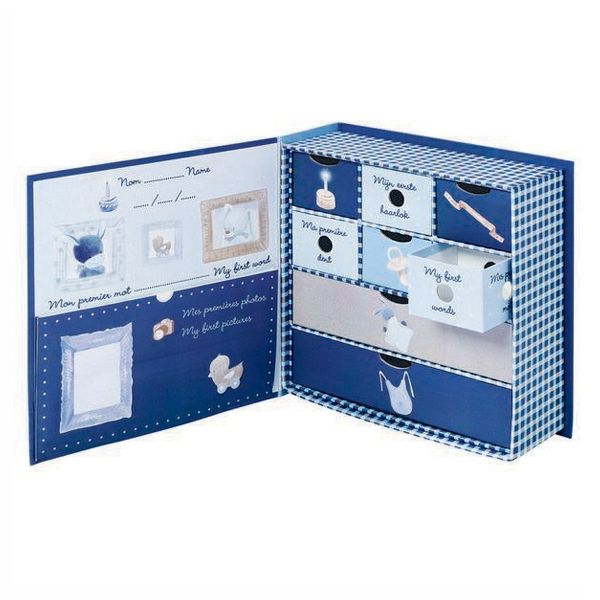 - Кутията е снабдена с 8 "чекмеджета", в които да съхранявате: свещичката от първия рожден ден, кичур от косичката, първата лепенка за рана, първото зъбче, залъгалка, лигавник и играчка, както и първите думи на Вашето дете.