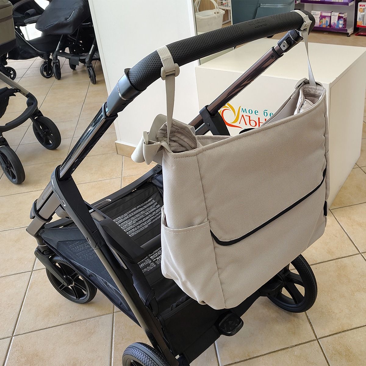 Чантата има една дълга дръжка, две къси дръжки и два ремъка за поставяне на дръжка на бебешка количка.