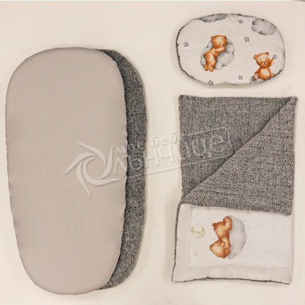 - Вътрешната част на възглавничката, завивката и чаршафчето Soft touch са изработени от мекa кохавлия, а памучното чаршафче и лицето на възглавничката и завивката от 100% памучен ранфорс.