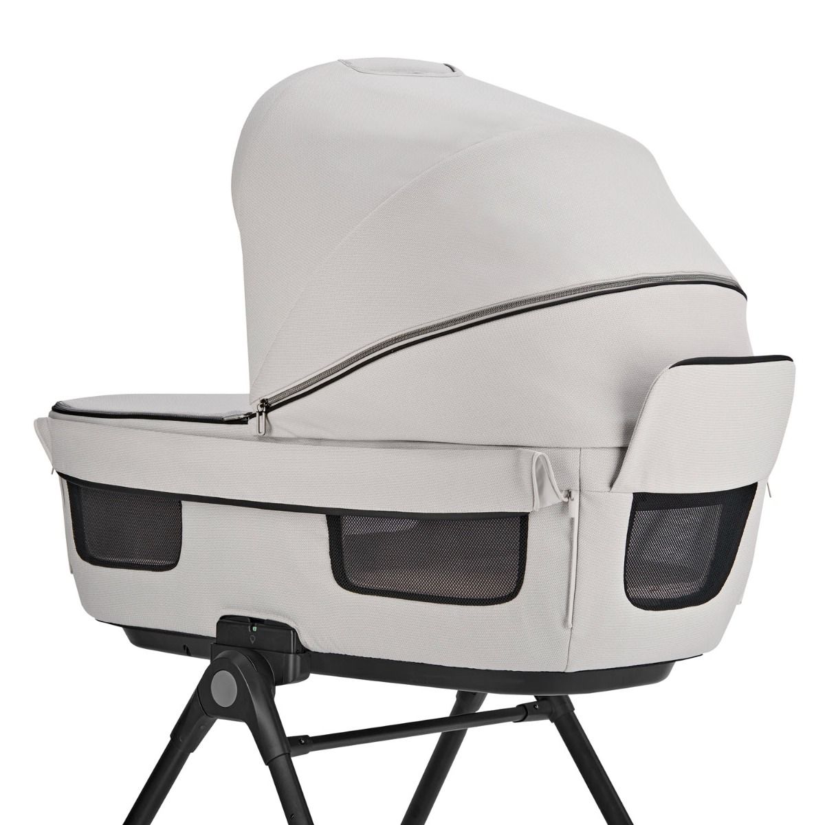 Лесно се прикрепя и отделя от рамата и стойката благодарение на системния механизъм в предната част. Зеленият индикатор показва, че коша за новородено е правилно поставен върху рамата.