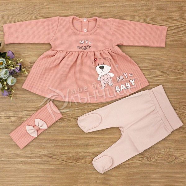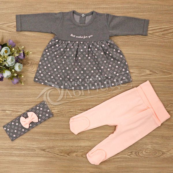 - Мек и комфортен комплект от 3 части, подходящ за момиченца, състоящ се от: