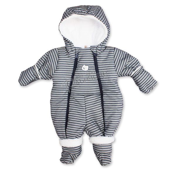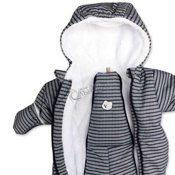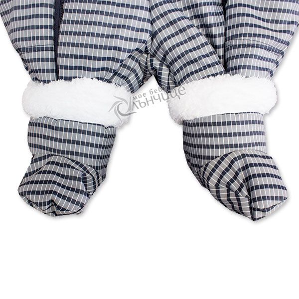 - Снабден с ръкавички и шушони за крачетата прикрепени с връзки, за да не бъдат изгубени.