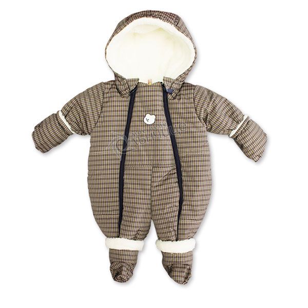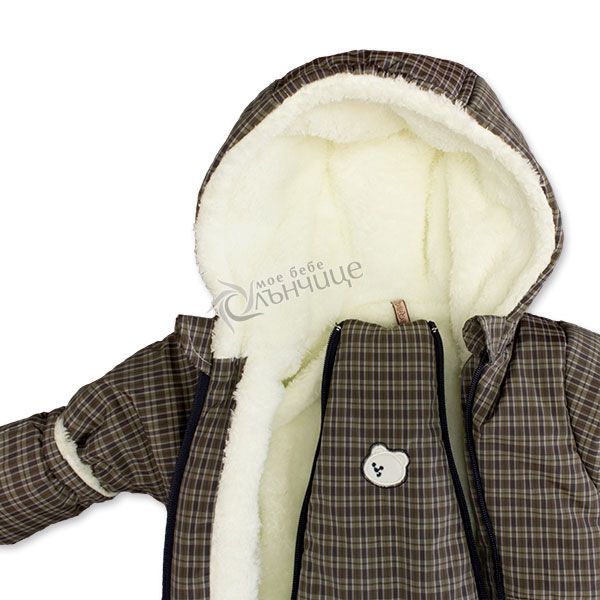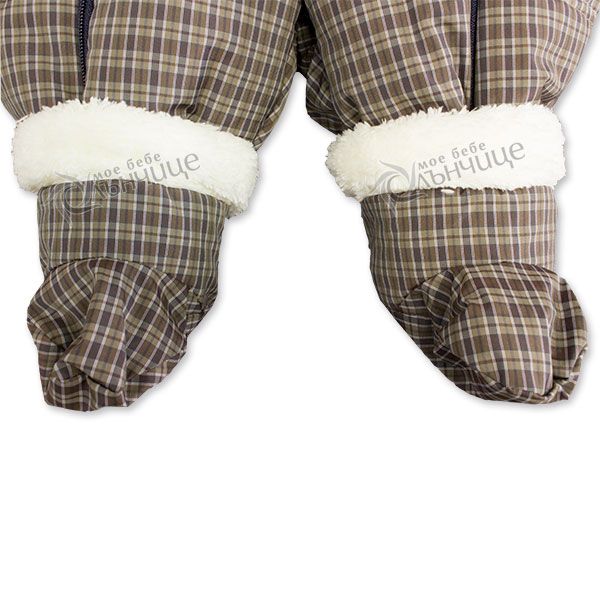 - Снабден с ръкавички и шушони за крачетата прикрепени с връзки, за да не бъдат изгубени.