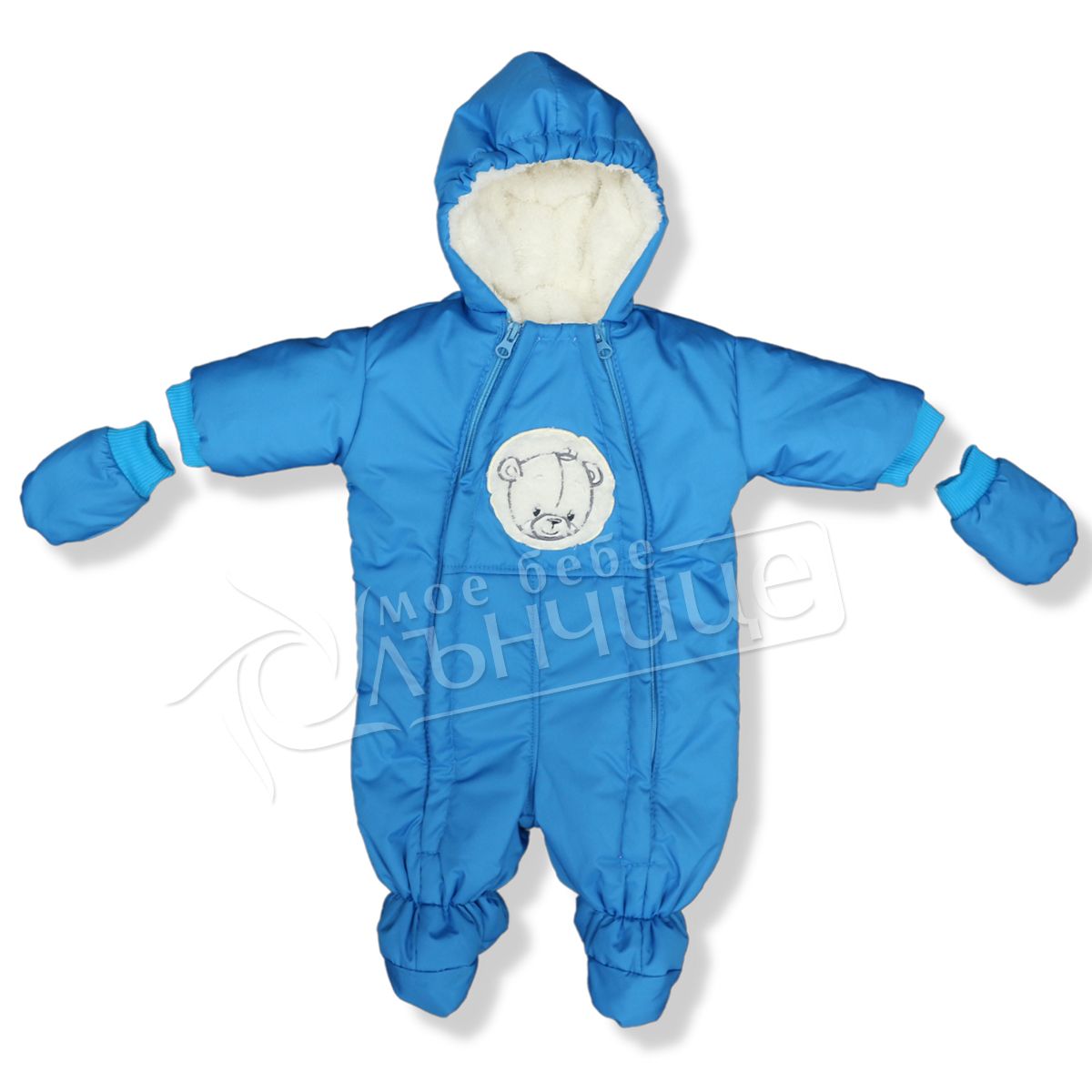 - Снабден с ръкавички и текстилни обувки, които не се свалят.