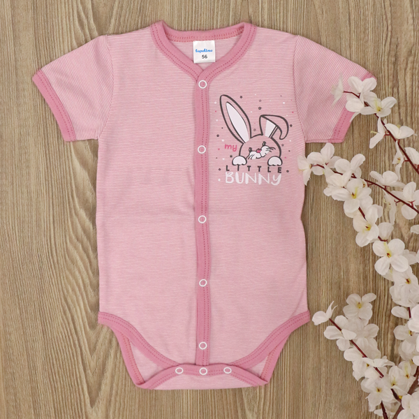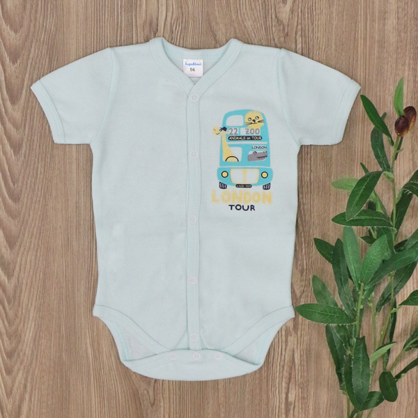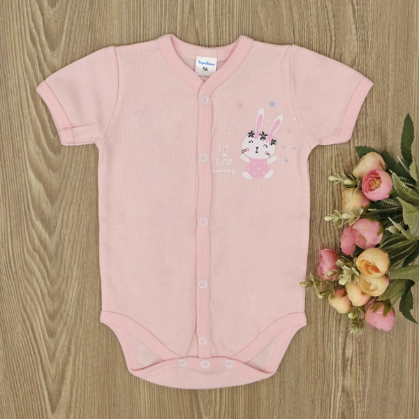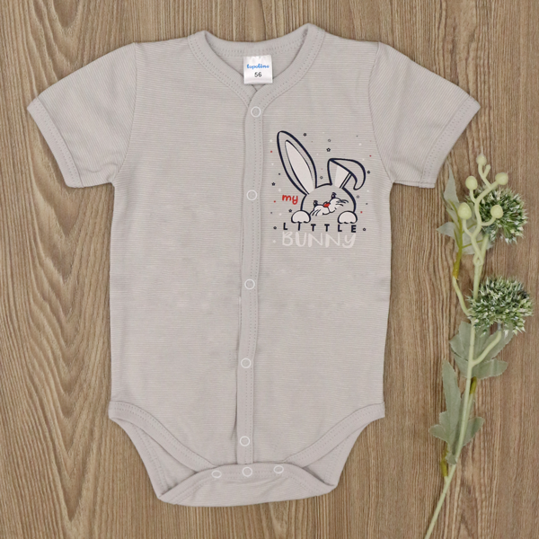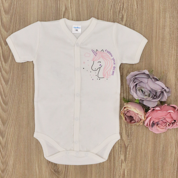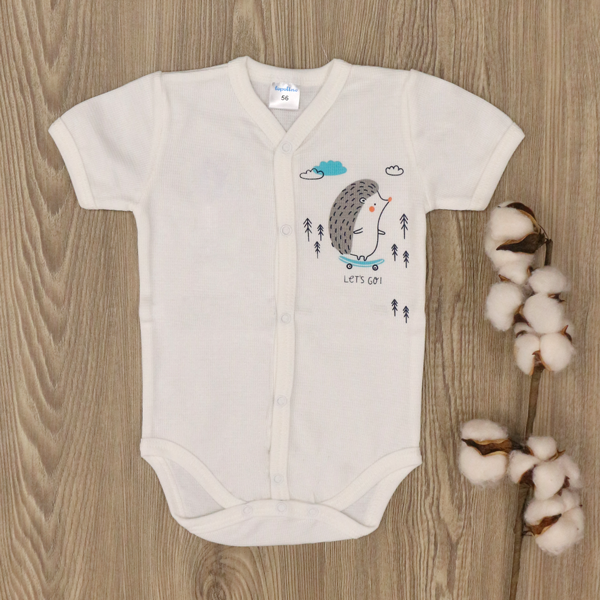 - Бебешко боди с къс ръкав, създадено от 100% памучно трико.