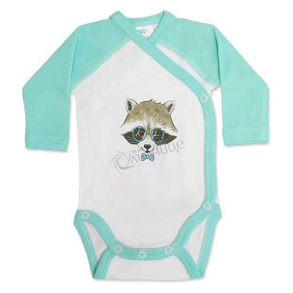- Бодито е тип „прегърни ме" с копчета тик-так в предната част и при крачетата, за да осигури удобно преобличане на новороденото.