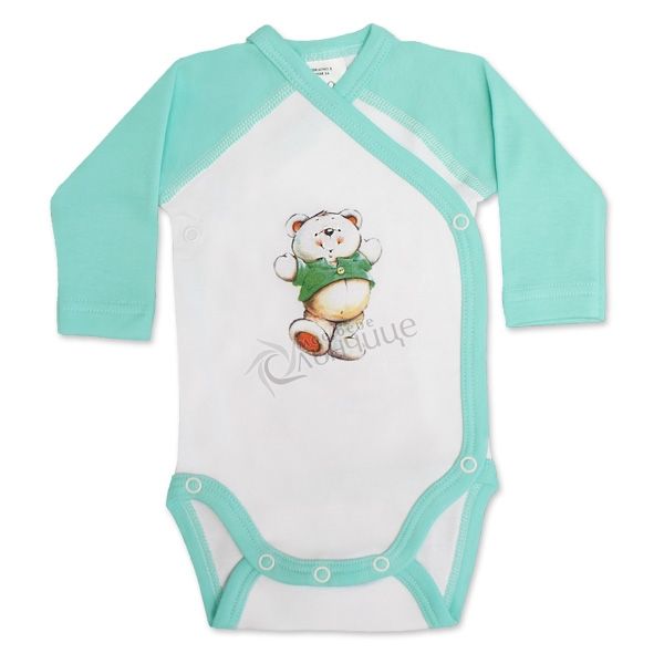 - Бодито е тип „прегърни ме" с копчета тик-так в предната част и при крачетата, за да осигури удобно преобличане на новороденото.