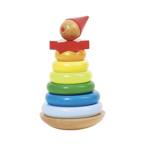 - Децата играят като нанизват ринговете върху дървената основа с пилонче. След това поставят звездичката и главичката на клоуна.