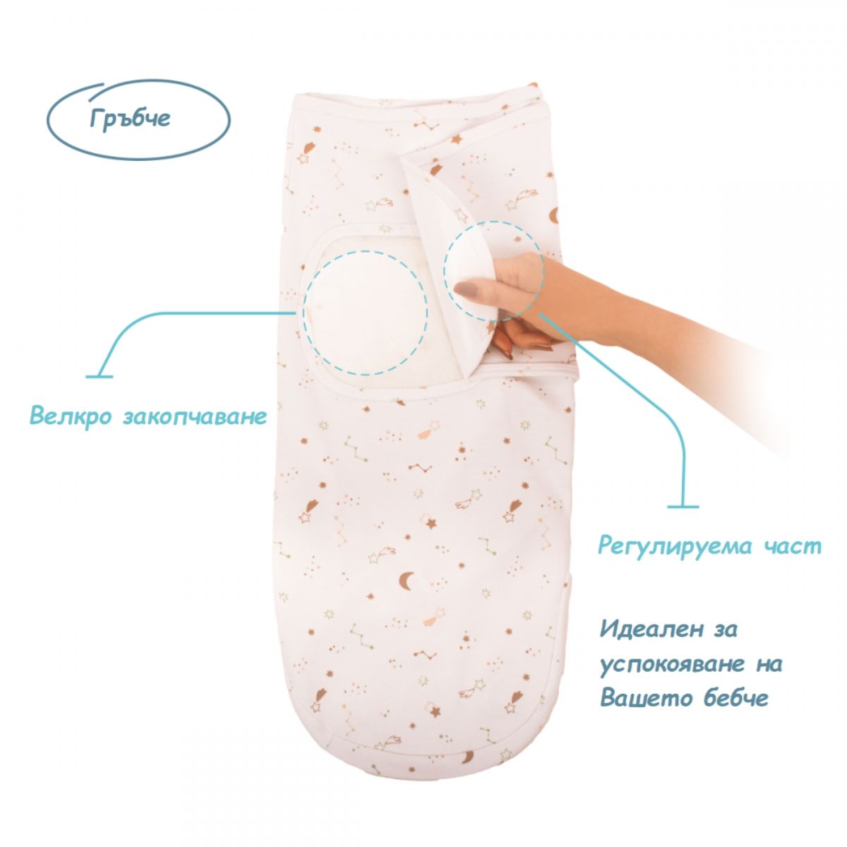 - Предвидената по-широка горна част се закопчава с велкро лепенки и обгръща ръчичките на бебето, което му дава усещане за сигурност и уют.