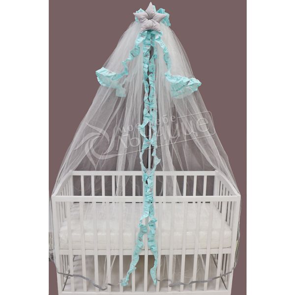 - Балдахин за детското легло изработен от нежен тюл и декориран с цветни панделки и елементи.
