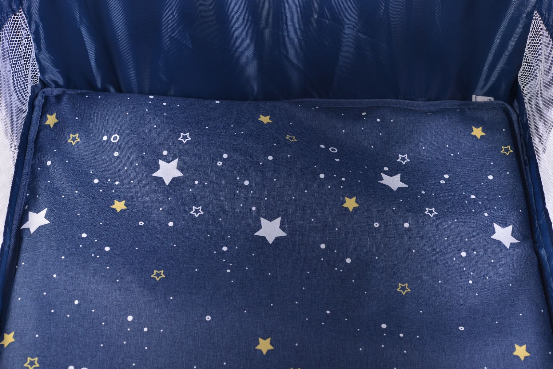 - От едната страна има отвор с цип, който позволява на детето в по-напреднала и активна възраст да влиза и излиза от кошарата, като я използва и за игра.
