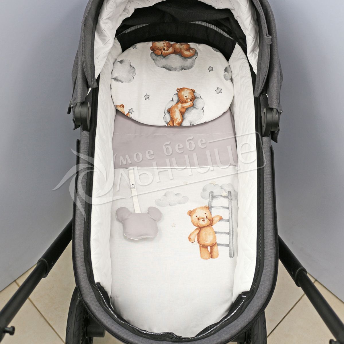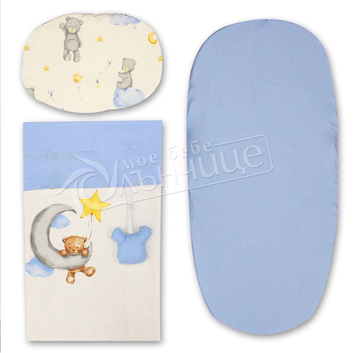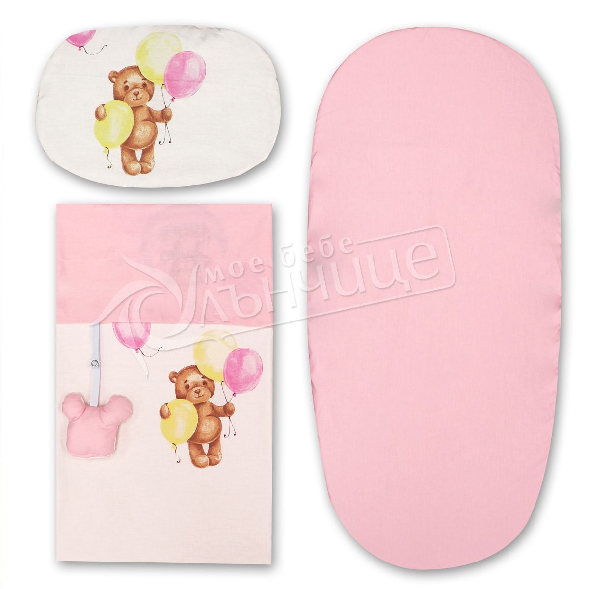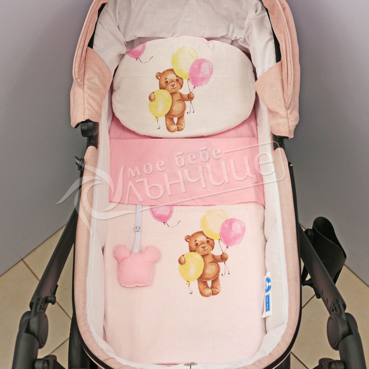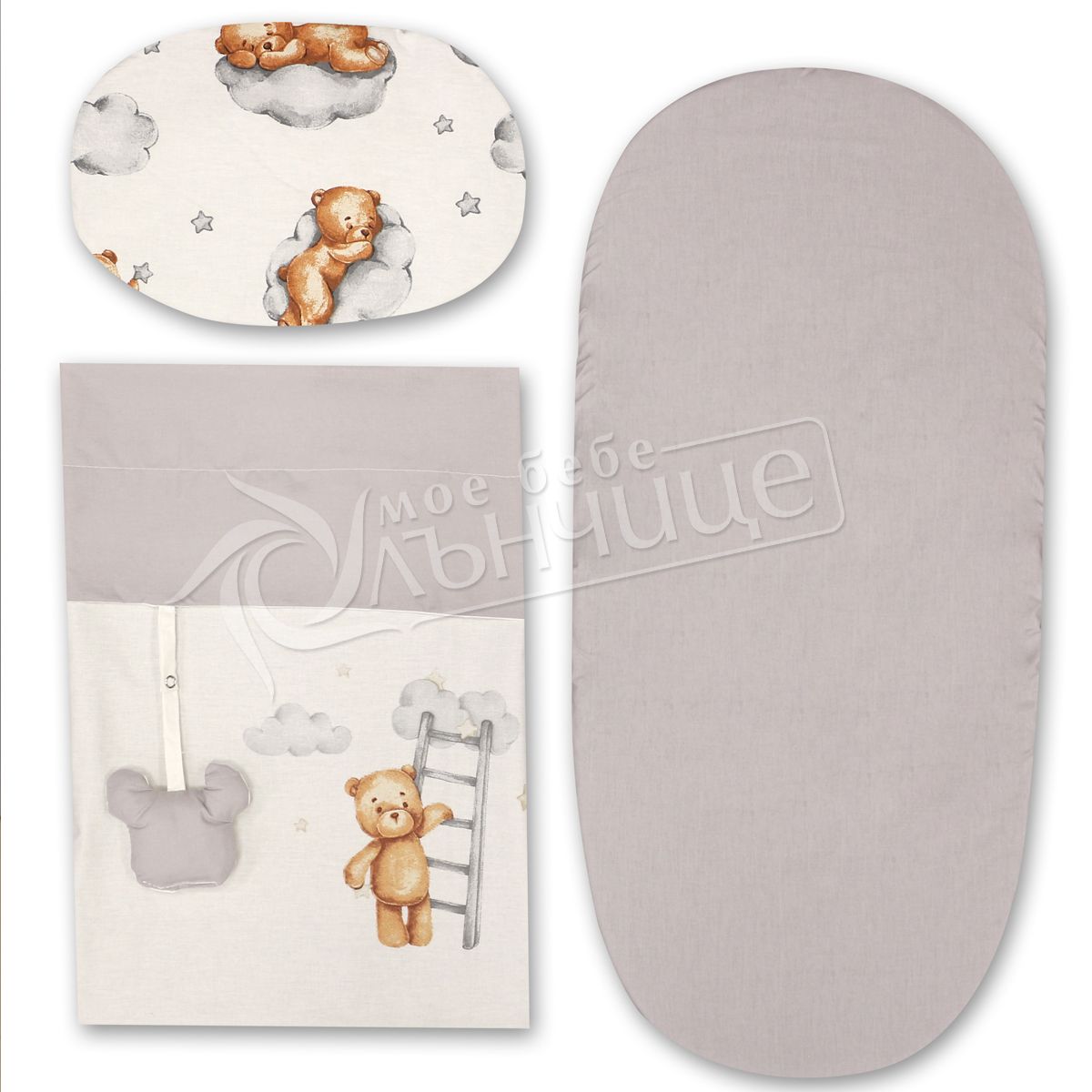 - Комплектът Teddy Bear се състои от четири части: възглавница, чаршаф с ластик (за матрачето), пелена и и сладка играчка, с която Вашето бебе може да си играе.