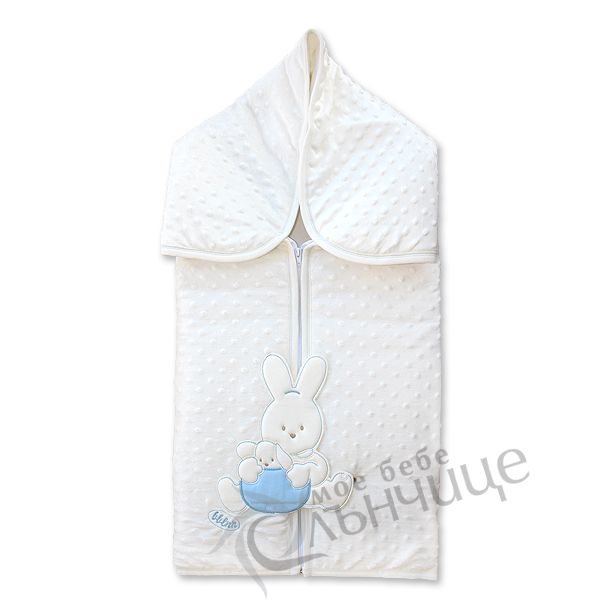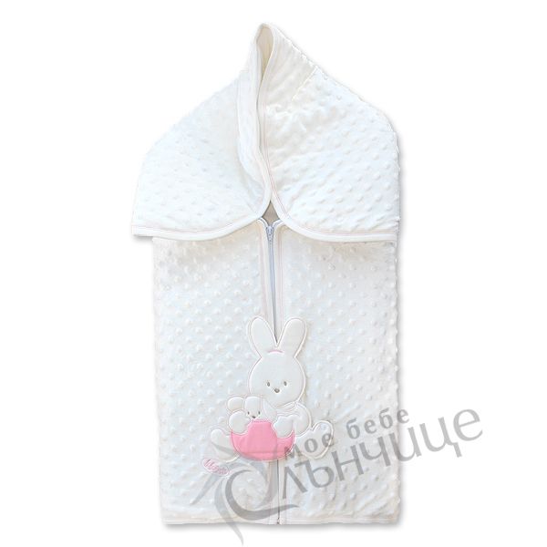 - Предлага се в бял цвят с очарователна апликация на малки зайчета, с нежно оцветени детайли в розов, бежов и син цвят.