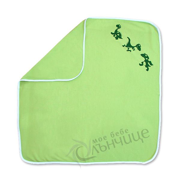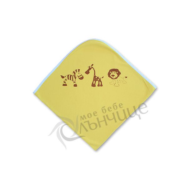 - Пелената се предлага в жълто и зелено с апликации на любопитни животни.