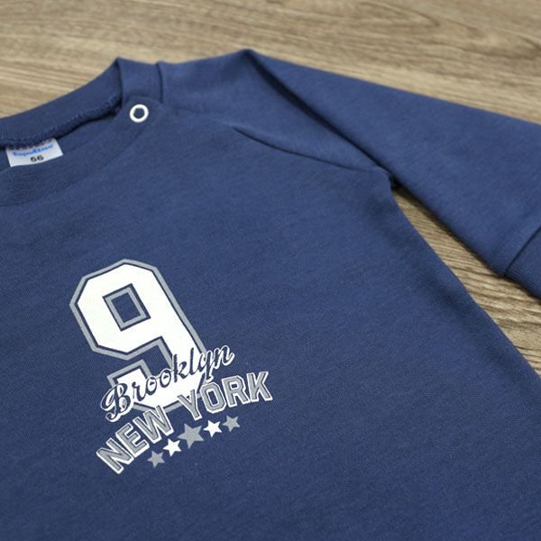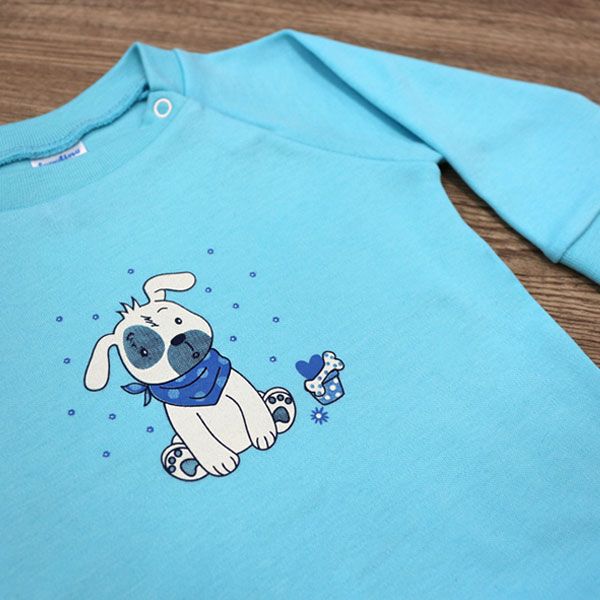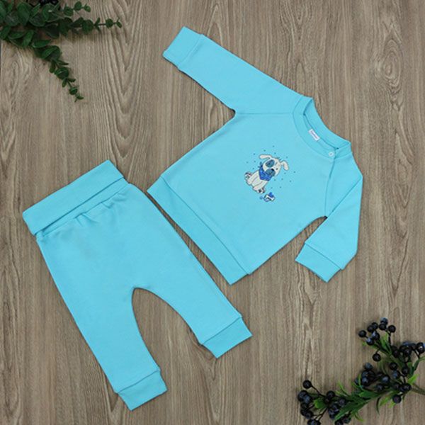 - Комплектът съдържа блузка с дълъг ръкав и панталон с широк ластик.