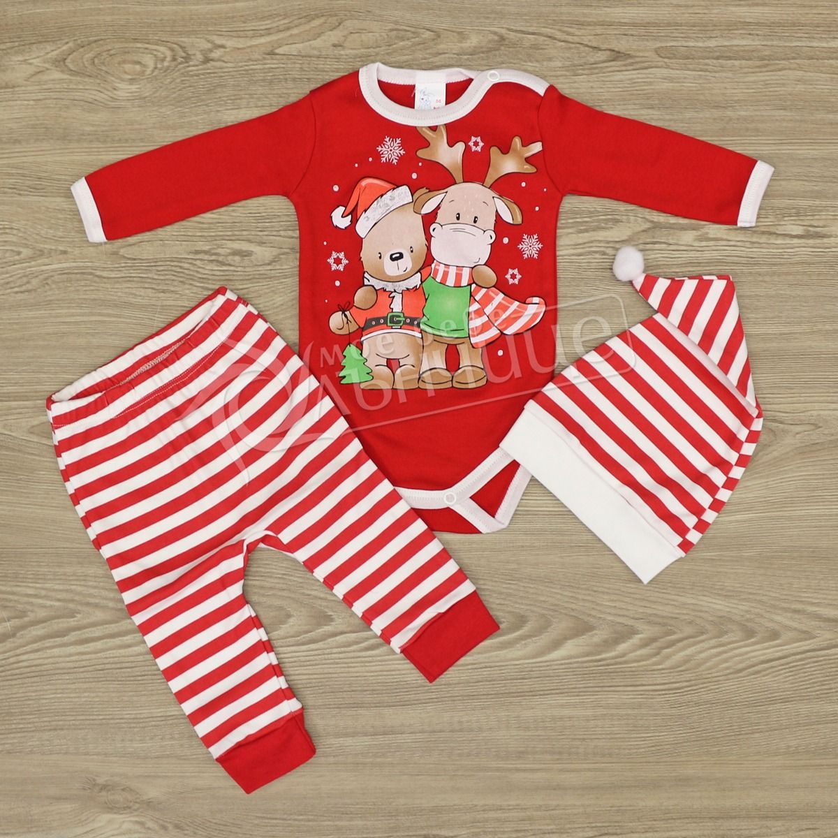 - Комплектът се състои от три части: боди с дълъг ръкав, ританки и коледна шапка.