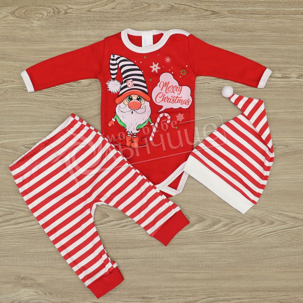 - Комплектът се състои от три части: боди с дълъг ръкав, ританки и коледна шапка.