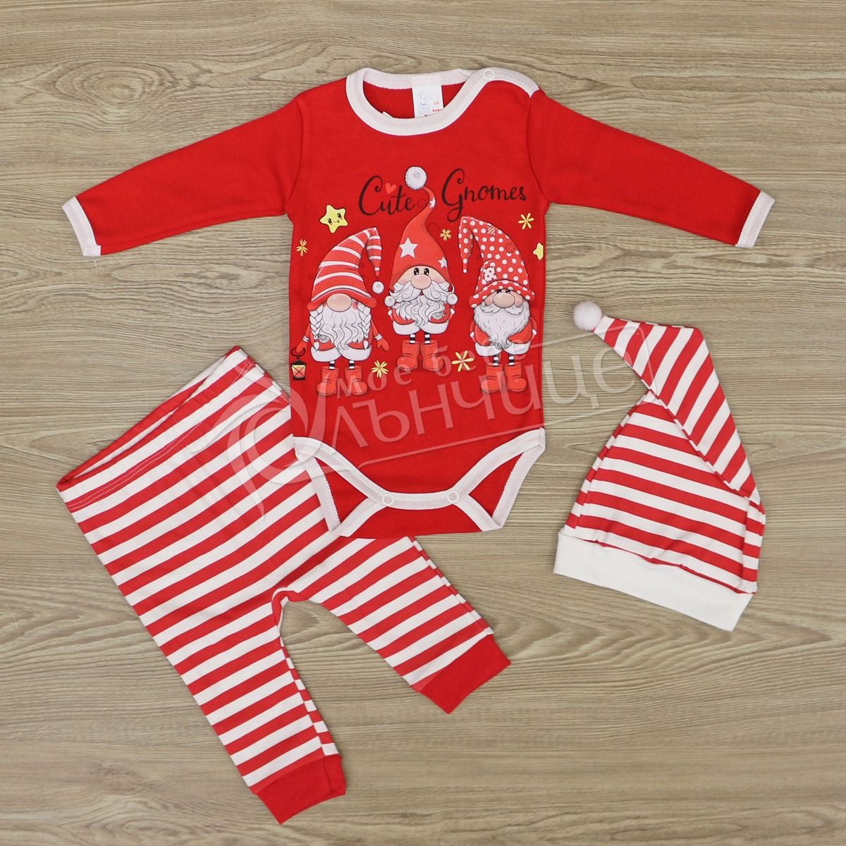 - Комплектът се състои от три части: боди с дълъг ръкав, панталонче и коледна шапка.