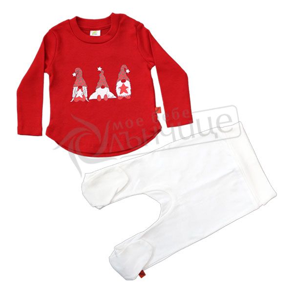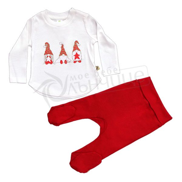 Комплектът се предлага в два цветови вариана: Бяла блузка с червени ританки или червена блузка с бели ританки
