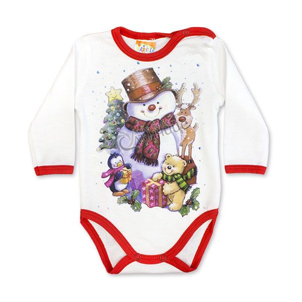 - Дълъг ръкав и копчета на рамото и при крачетата.