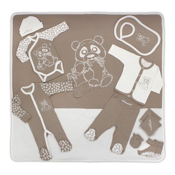 - Комплектът съдържа 11 части - пелена, гащеризон и жилетка с предно закопчаване, ританка, боди с дълъг ръкав, ръкавички против драскане, буйки, лигавник, шапка и 2 броя попивателни кърпи.