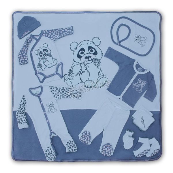 - Комплектът съдържа 11 части - пелена, гащеризон и жилетка с предно закопчаване, ританка, боди с дълъг ръкав, ръкавички против драскане, буйки, лигавник, шапка и 2 броя попивателни кърпи.