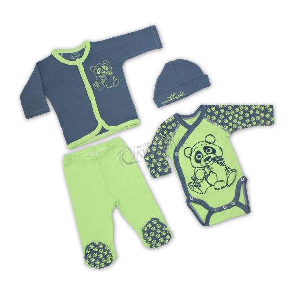 - Комплектът съдържа 4 части - боди с дълъг ръкав, жилетка с предно закопчаване, ританки и шапка.