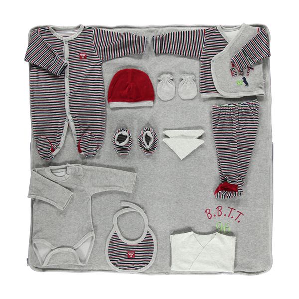 Бебешки комплект изработен от първокачествени материали, състои се от 12 части. Създаден с грижа и вкус за малкото бебе. Предлага се в интересна и модерна комбинация от цветове сиво и червено с весел десен на райе.