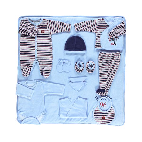 Комплект за изписване на новородено от 12 части. Изключително качествен и мек на допир плюш, много подходящ за студените месеци. Предлага се в модерна комбинация от светло и тъмно синьо с допълнение от симпатичко райе.