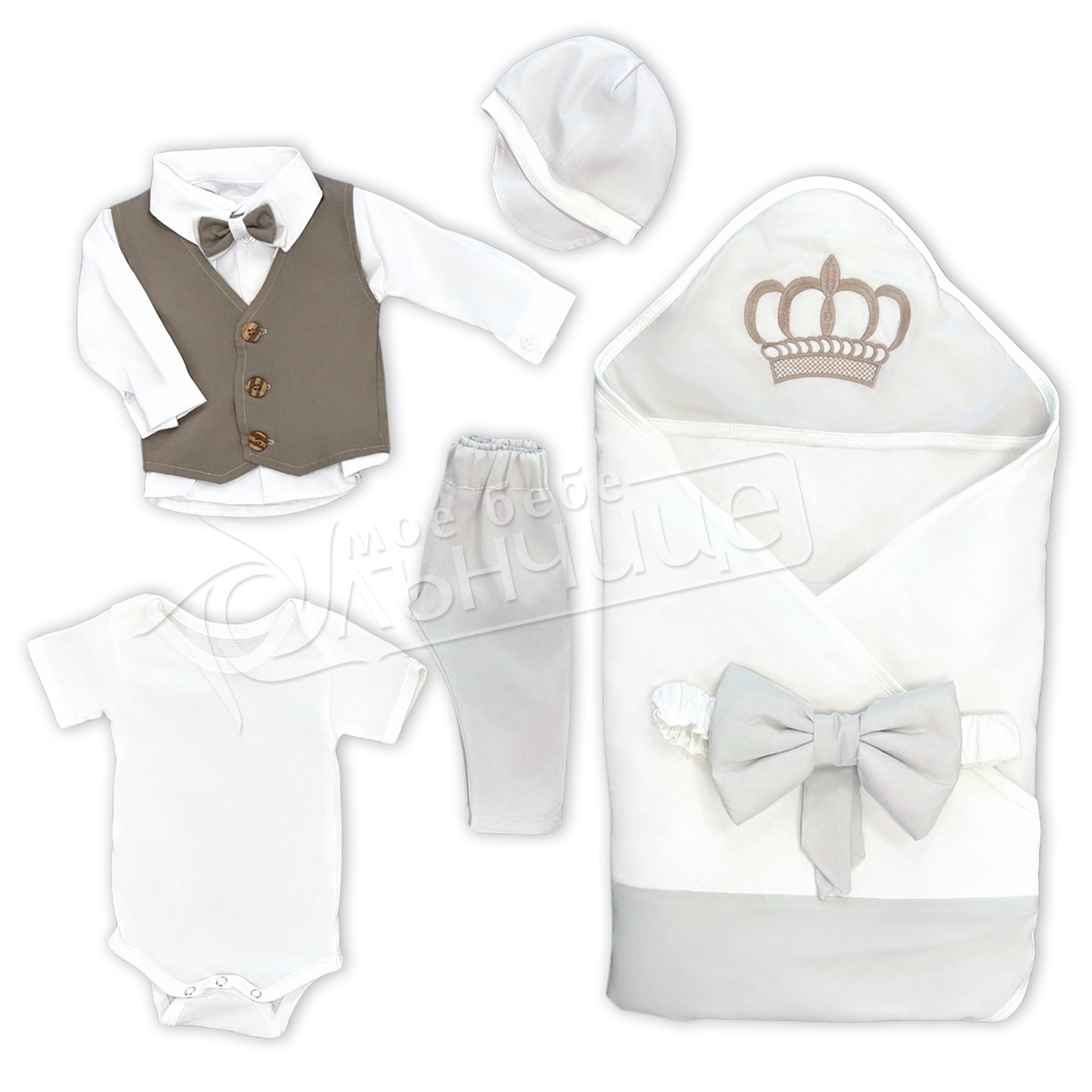 - Комплектът включва: панталон, риза, елек, боди с къс ръкав, шапка, папионка и пелена и панделка за фиксиране