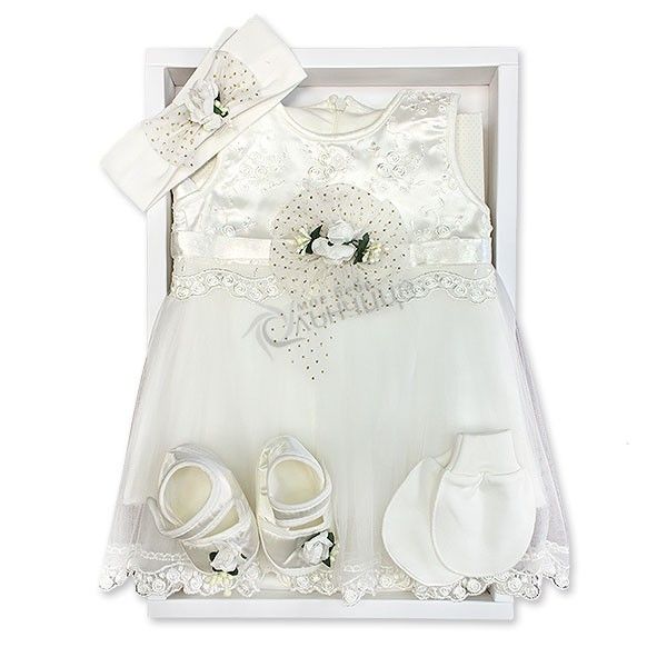 Изящен комплект за изписване на новородено момиченце. Красива комбинация от перлено бяло с нежни и деликатни акценти. Дизайн изработен до съвършенство от 100% памук, ефирна органза и мека дантела. Комплект от анти-алергична материя, който обгръща в сладка преградка Вашето бебе. Предлага се в цвят бял и шампанско