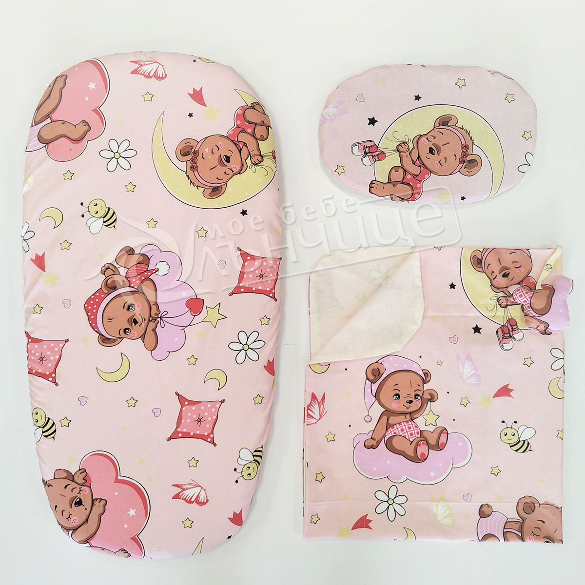 - Комплектът Sleepy Baby Pink се състои от четири части: възглавница, чаршаф с ластик (за матрачето), пелена и сладка играчка, с която Вашето мъниче може да си играе.