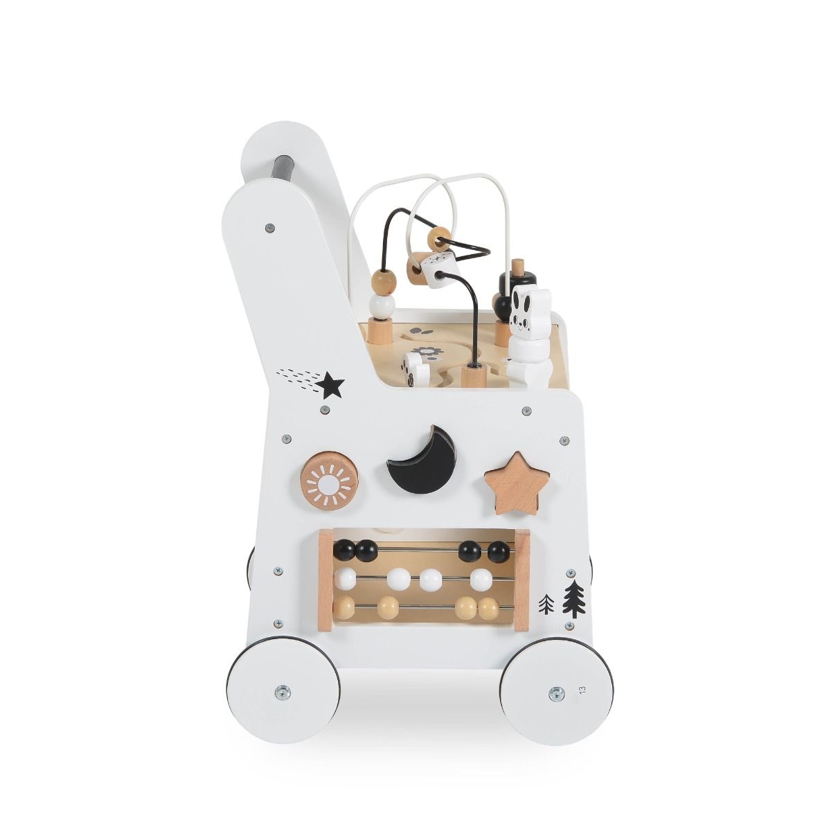 - Дървената играчка за прохождане от Moni Toys е създадена да подкрепи детето в първите му стъпки, като съчетава стабилна опора и разнообразни занимания
