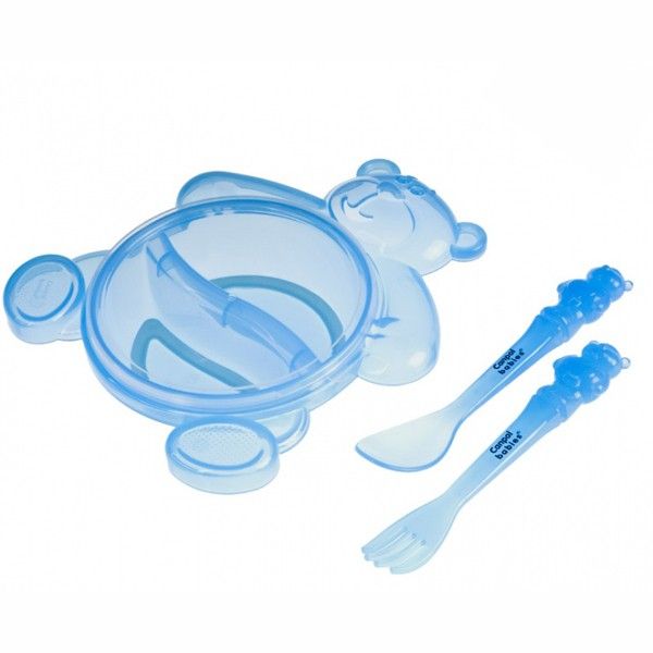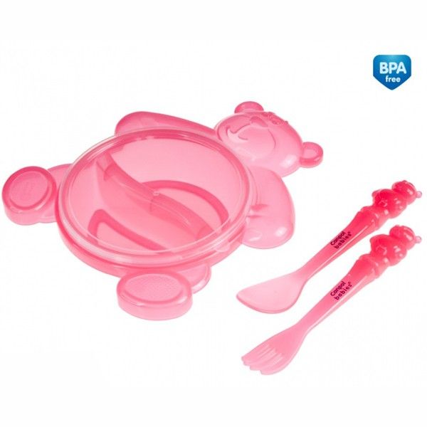 - Комплекта за хранене е изработен от нечуплива пластмаса с неплъзгащо се дъно.