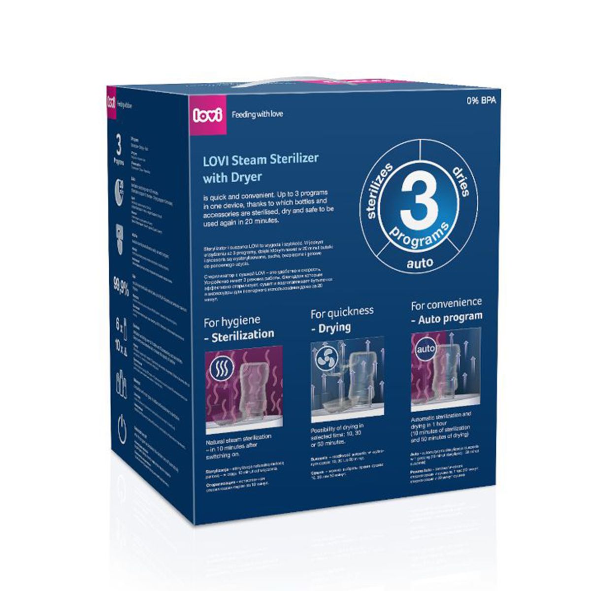 - 3 програми в едно устройство: стерилизация с естествена пара, уникална функция за сушене и автоматична програма, свързваща двете функции.