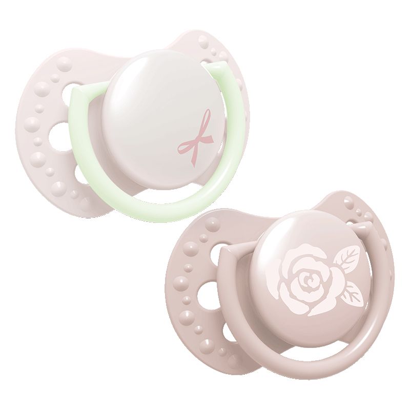 - Дръжката на една от залъгалките в комплекта свети в тъмното, така че е лесно да се намери през нощта.