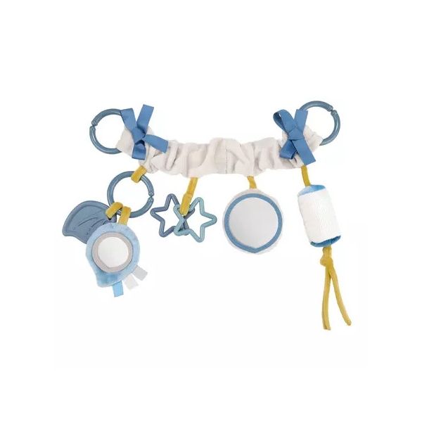 - Включва звънче, дрънкалка, шумящи елементи, меко огледало и чесалки за венци.