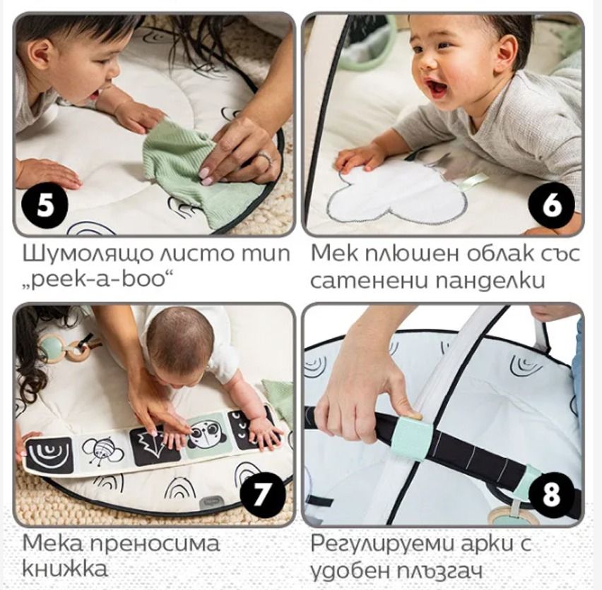 - Благодаение на плюшеният облак и цветните сатенени панделки на подложката бебето се запознава с различни текстури, същевременно те развиват неговата фината моторика
