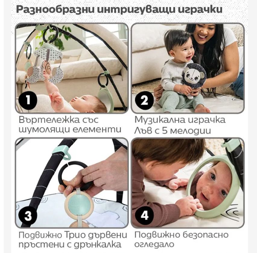 Използвайте всеки възможен момент да покажете на Вашето бебенци красотата на заобикалящия го свят и така опознавайки го, да позпомогнете ранното му развитие - двигателно и интелектуално. Активна гимнастика Tiny Love Developmental Gyminiа Ви дава възможност да направите това по забавен и интригува начин.