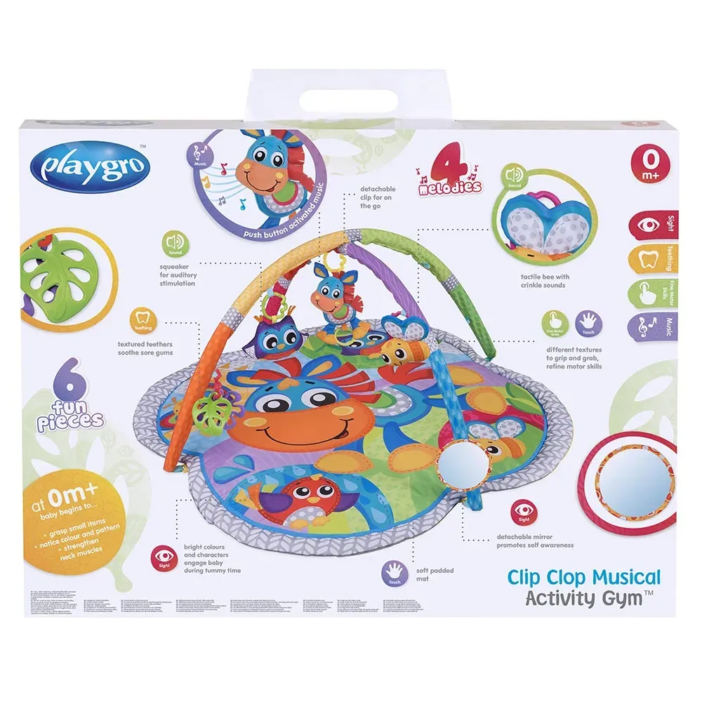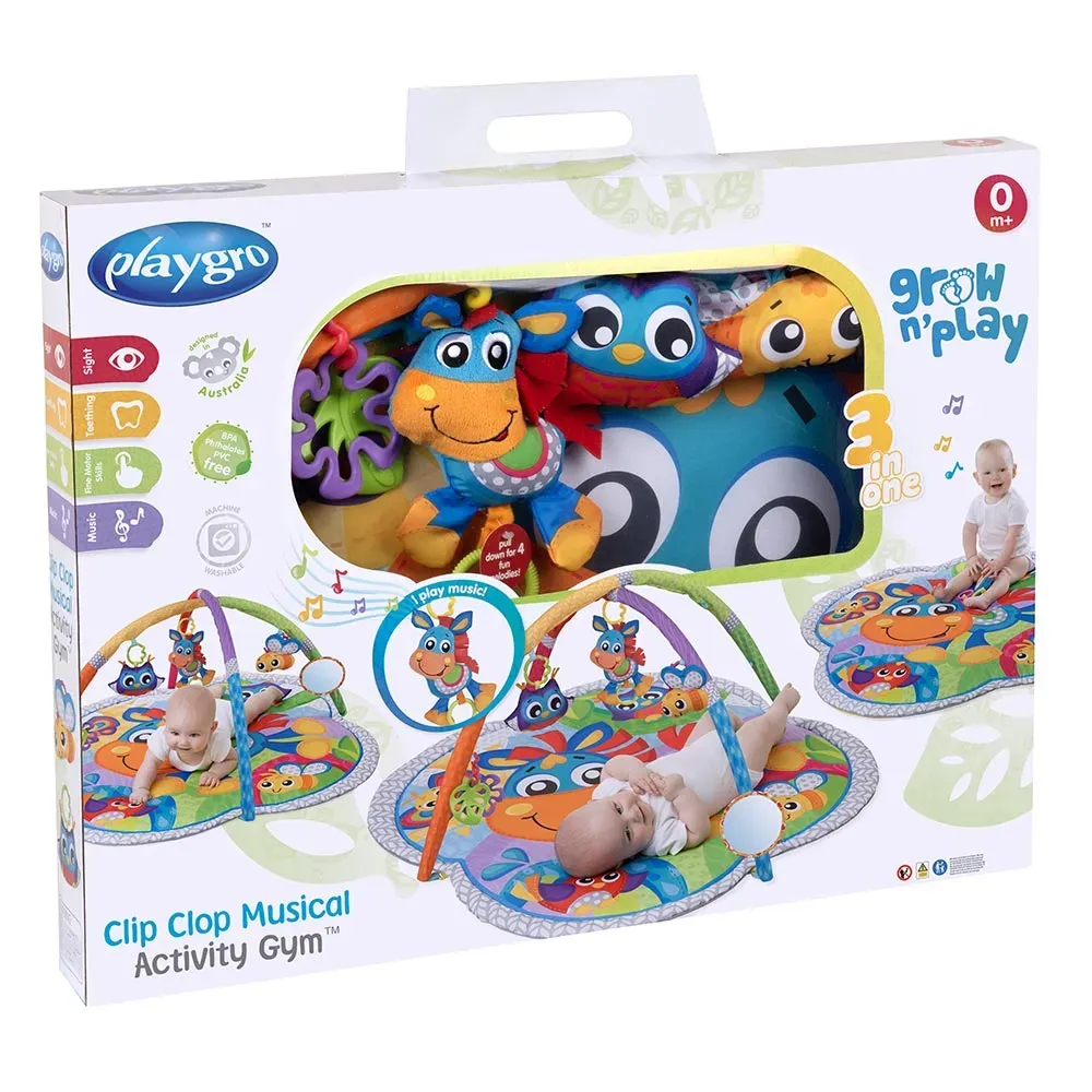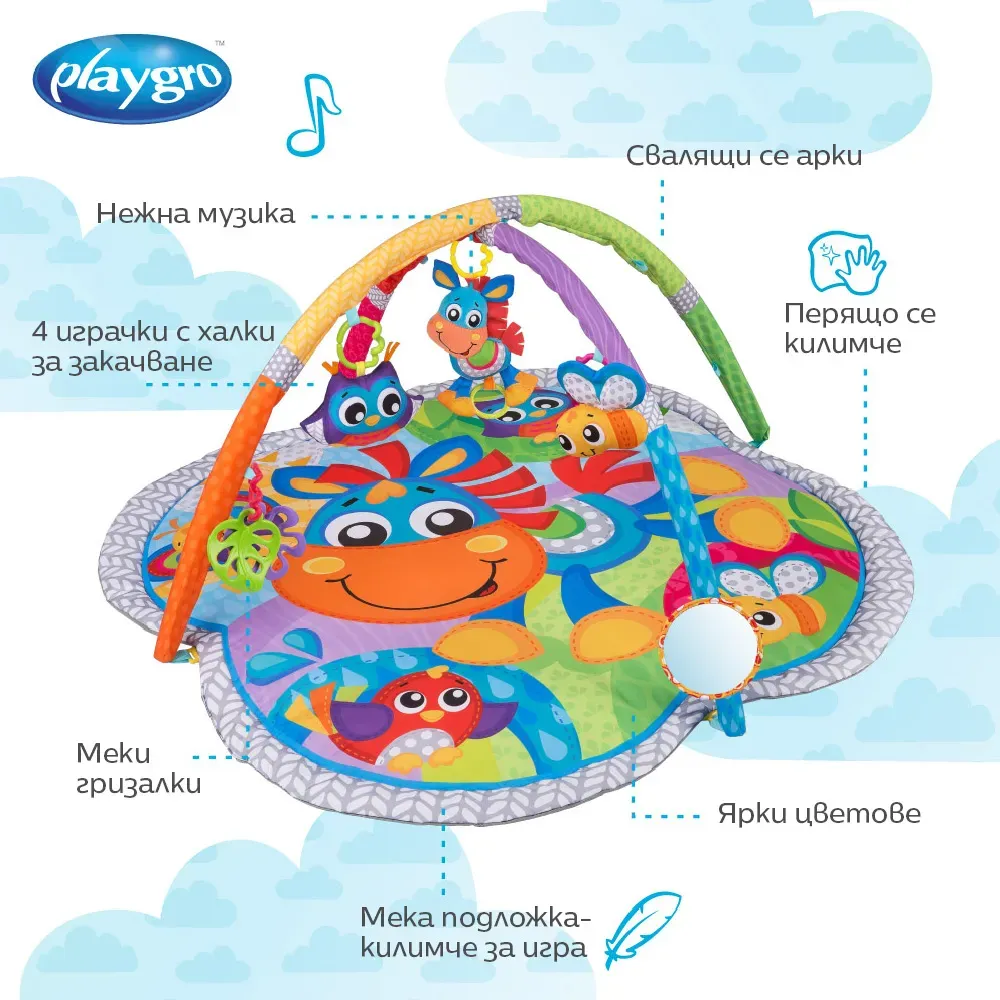 Музикална активна гимнастика Конче Хоп Троп - Playgro предлага едно пълноценно преживяване за игра и развитие още от първите дни на бебето.