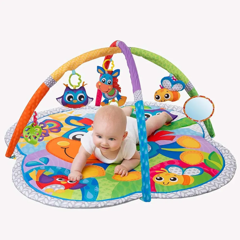 - Около него са разположени четири висящи, свалящи се играчки и безопасно огледало, които приканват бебето да гледа, да докосва и да протяга ръчички – така се развиват грубата и фината моторика, координацията око-ръка, както и любопитството.