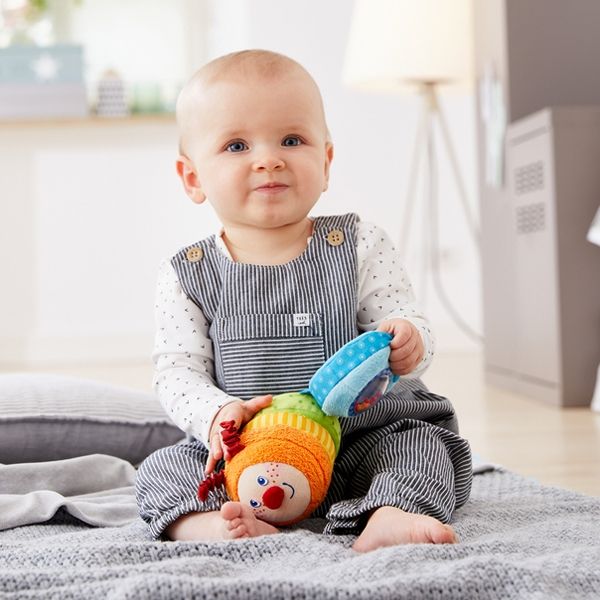 - В края на гъсеничката има полусфера с много шарени топченца, които детето може да използва като дрънкалка.