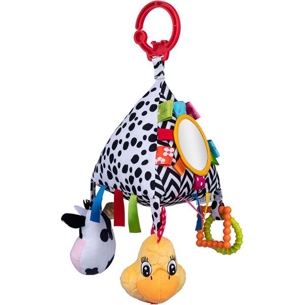 - С животни и други контрастни шарки, както и разноцветни етикети , които привличат вниманието на вашето любознателно дете и развиват усета му за форми, цветове и звуци