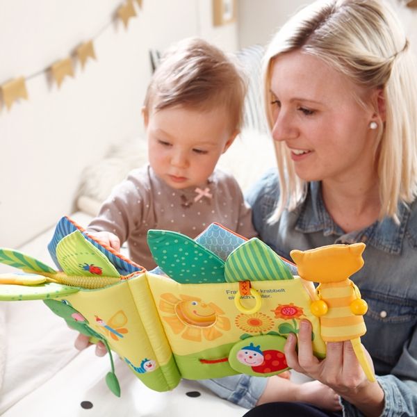 - На всяка страница има много интерактивни елементи, които ще забавляват детето - чудесни поеми на немски, листа с вложени шумящи елементи, огледалца, въртящи се елементи и въженца за подръпване.