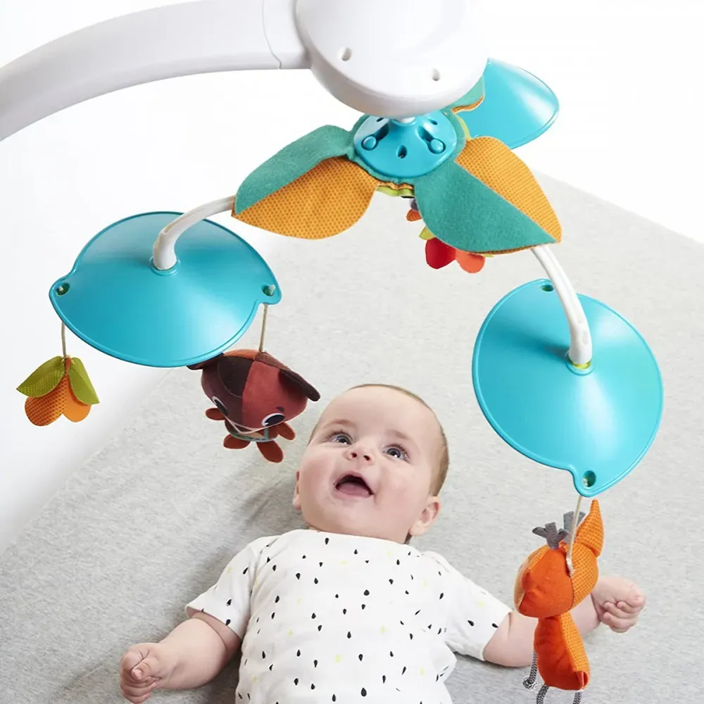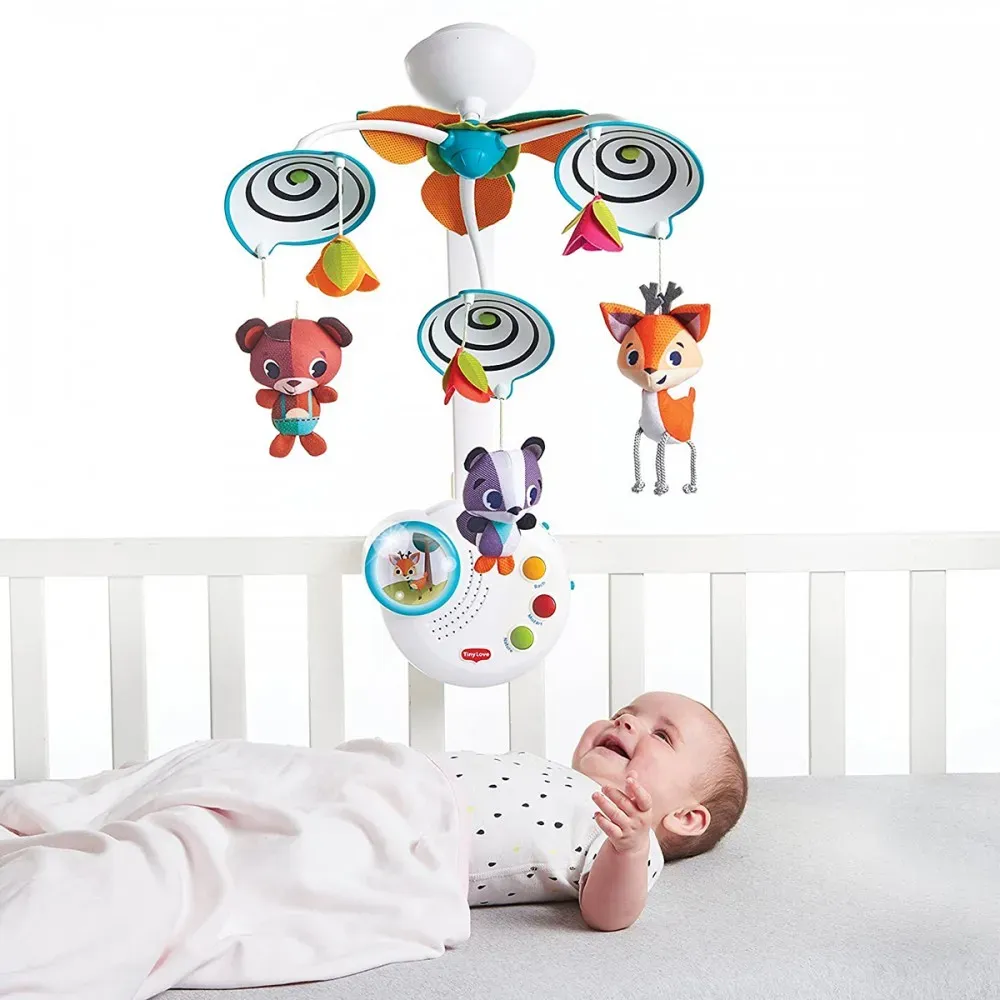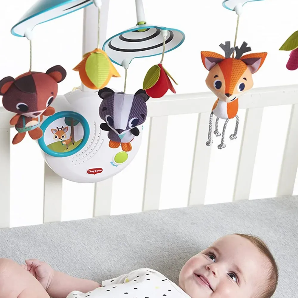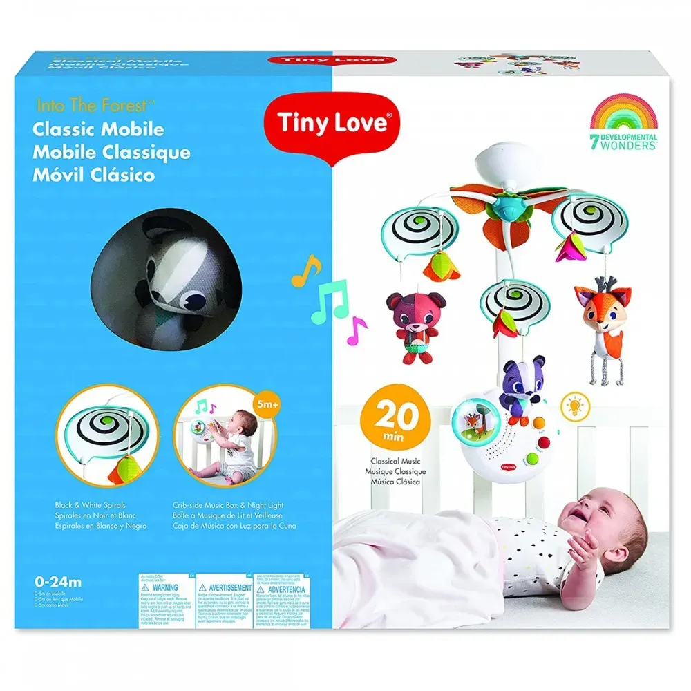 Бебешка музикална въртележка за легло Tiny Love Classic Into the Forest ще потопи твоето мъниче в един вълшебен горски свят, обитаван от мече, сърничка и енот.