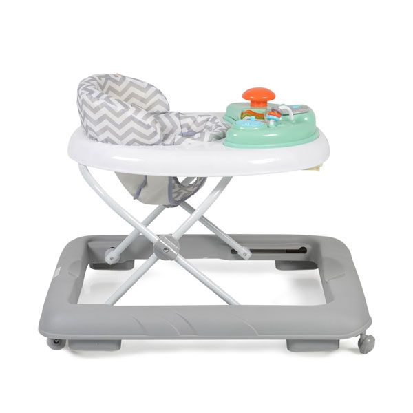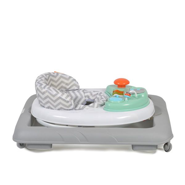 Проходилката разполага с 3 нива на регулиране на височината, в зависимост от ръста на Вашето дете. Меката тапицирана седалка осигурява допълнително удобство на малчуганите. - Двете предни колелца се въртят на 360°, а задните са силиконови и са с праволинейно движение. За безопасността на Вашето детенце ще се погрижат и силиконови стопери, които ще го предпазят, когато е в близост до стълби и други стръмни терени.