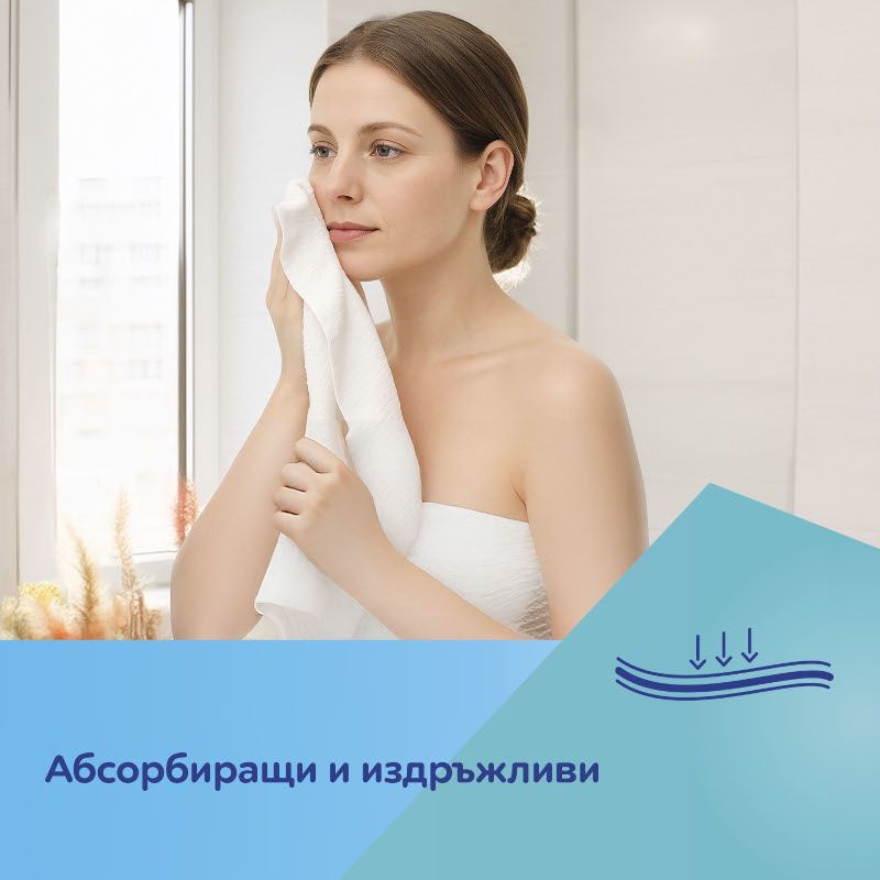 - Кърпите са изработени от 100% дишаща вискоза, която осигурява добра абсорбция и приятен допир до кожата.