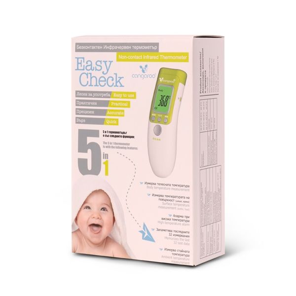 - 5в1 безконтактен термометър: измерва температурата на детето; измерва температурата на бебешкото шише с мляко; измерва температурата в детската стая; разполага с аларма, която се активира при висока температура; запаметява последните 32 измервания.