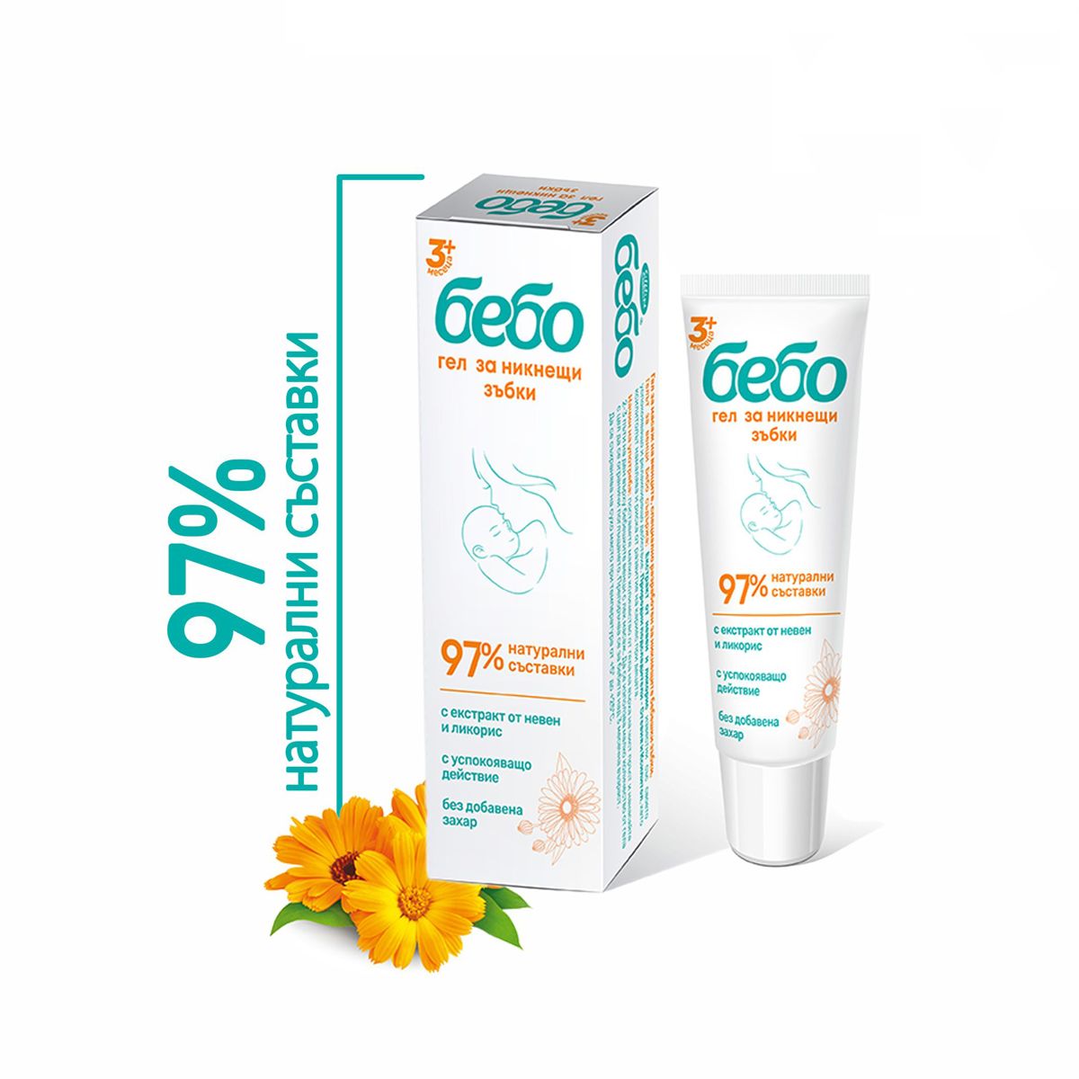 - Натурални екстракти от невен и ликорис за трайно облекчение на дискомфорта от поникващите зъбки.